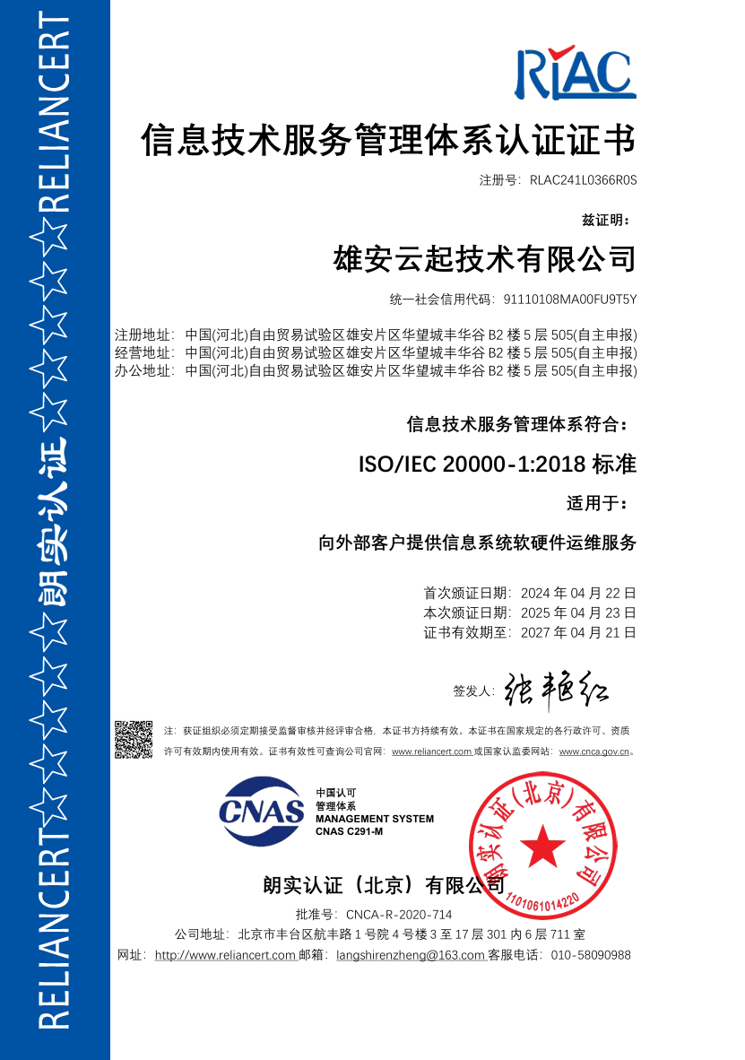 ISO20000信息技术服务管理体系认证证书